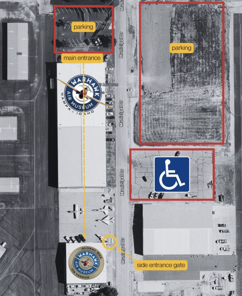 The Kilroy Coffee Klatch will be in the new Global War on Terror hangar! The parking lot closest to the GWOT building will be reserved for handicap parking. There will be a golf cart on hand to help shuttle people as needed. You can enter through the main door and walk down to the GWOT hangar, or use the side gate entrance marked on the map.