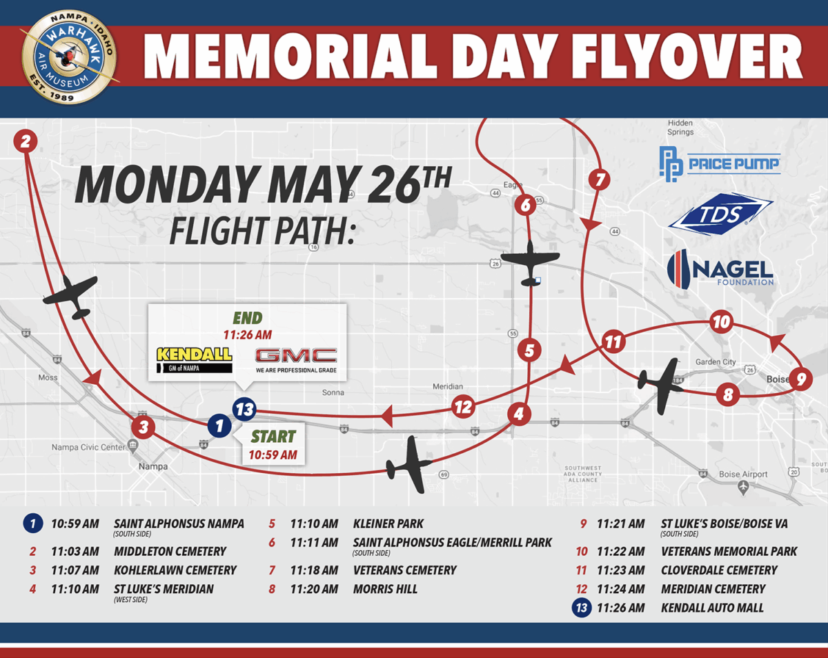 * Flying is weather-dependent, and changes will be announced via our Facebook page. Flyover location times are approximate. The Museum will be open from 9 a.m. to 5 p.m. on Memorial Day.