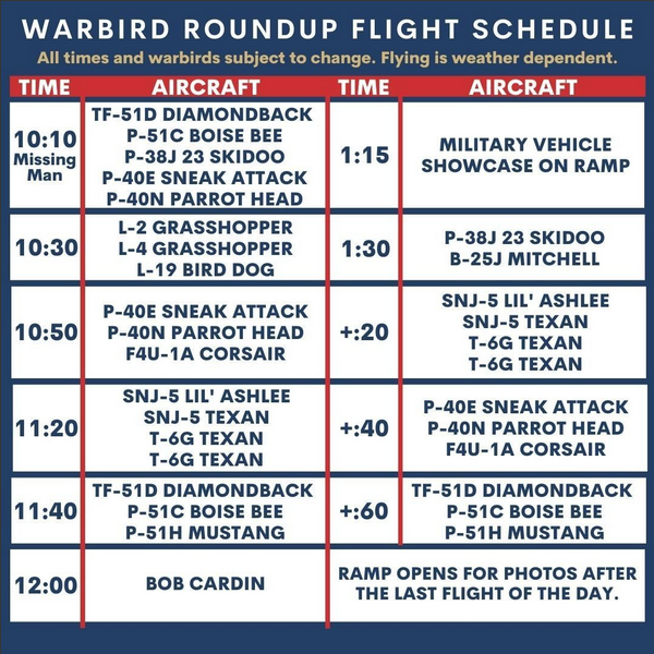 *Schedule is approximate and weather/warbird dependent. SCHEDULE IS SUBJECT TO CHANGE WITHOUT NOTICE. TIMES ARE APPROXIMATE.