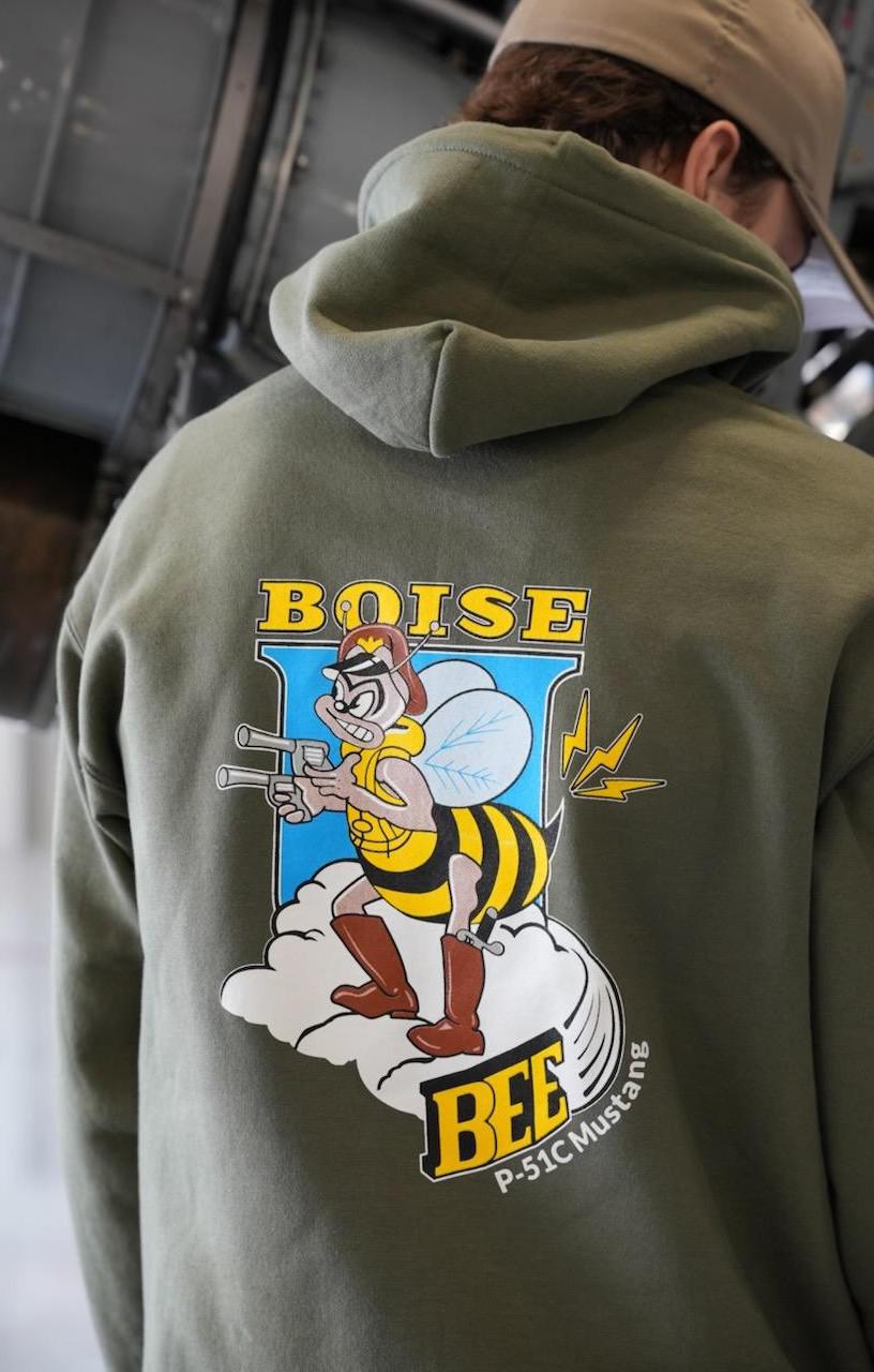 Celebrate aviation history with this exclusive Boise Bee Hoodie from the Warhawk Air Museum. Inspired by the iconic nose art of the P-51C Mustang, this design features a daring cartoon bee pilot, complete with flight goggles, bomber cap, and twin cannons, bursting through a cloud with bold vintage energy.